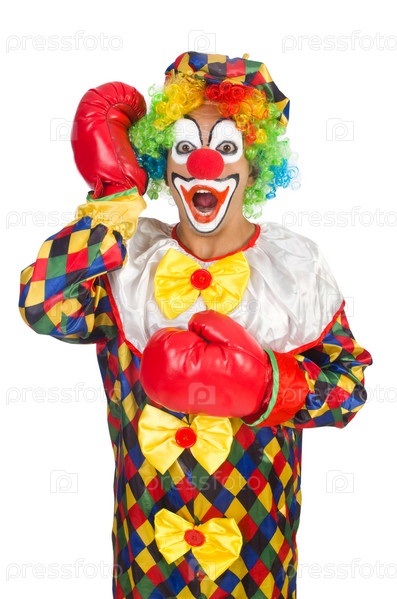 Клоун с боксерскими перчатками, изолированный на белом фоне