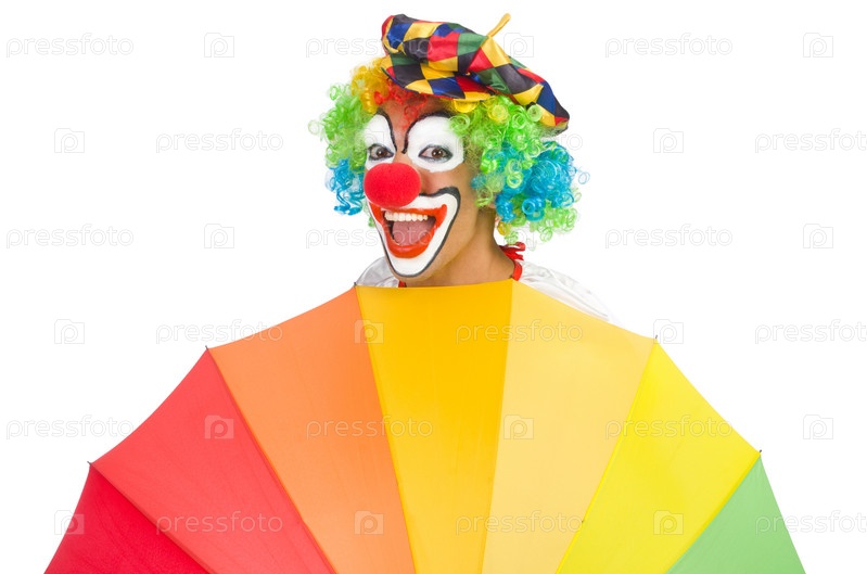 Клоун с зонтиком, изолированный на белом фоне