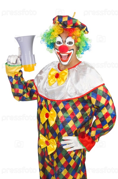 Клоун с громкоговорителем на белом фоне