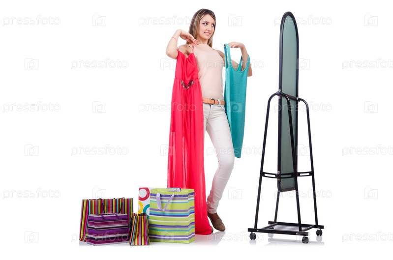 Женщина меряет новую одежду на белом