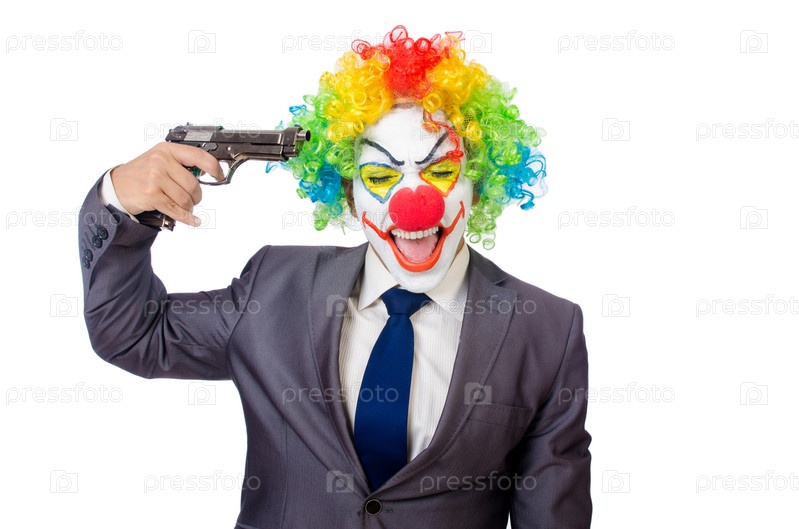 Бизнесмен клоун с пистолетом, изолированный на белом фоне