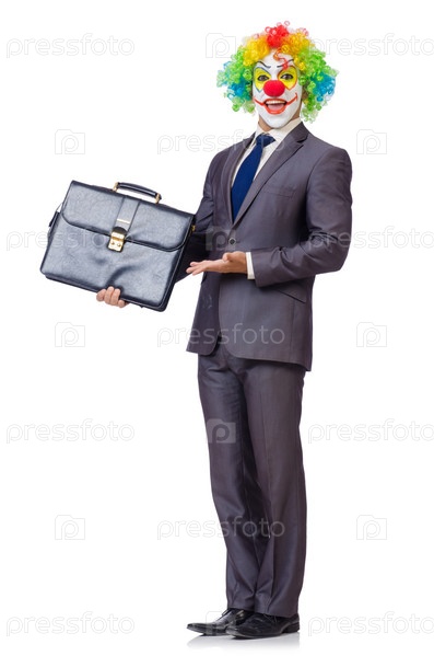 Бизнесмен клоун, изолированный на белом фоне