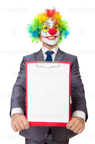 Бизнесмен клоун, изолированный на белом фоне