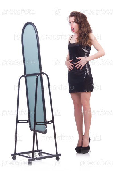 Женщина меряет новую одежду на белом