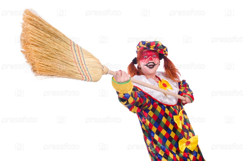 Клоун с метлой, изолированный на белом фоне