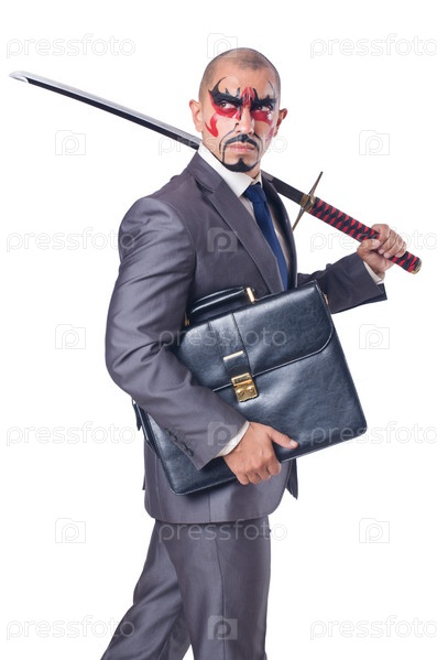 Бизнесмен с мечом, изолированный на белом фоне