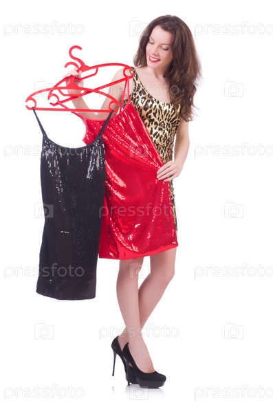Женщина меряет новую одежду на белом