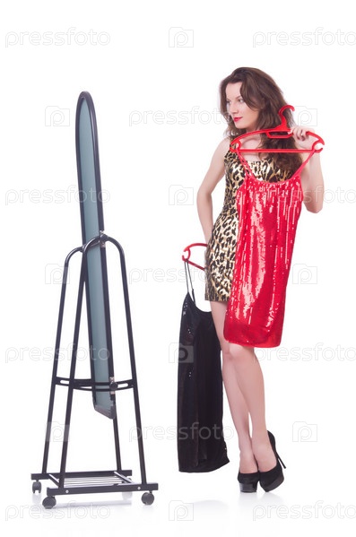 Женщина меряет новую одежду на белом