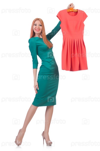 Женщина меряет новую одежду на белом