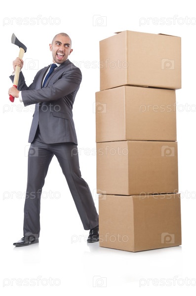Бизнесмен с коробками, изолированный на белом