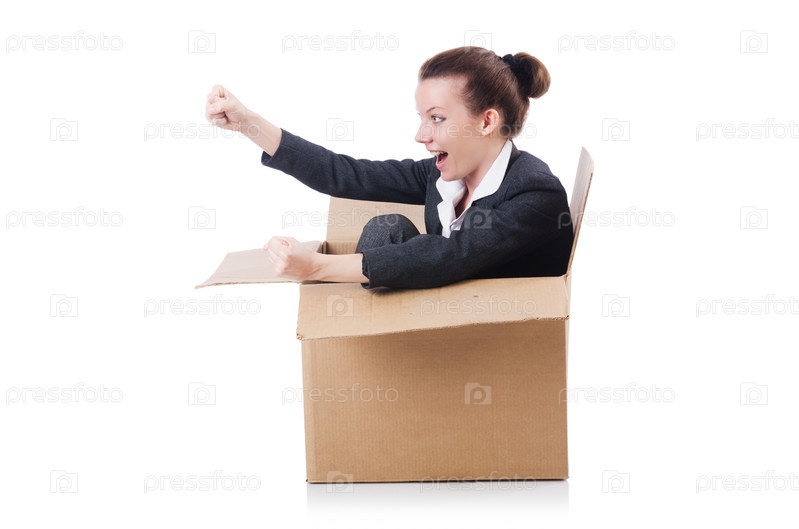 Бизнес-леди в коробке на белом фоне