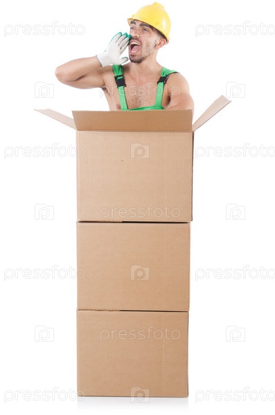 Мужчина в зеленом комбинезоне с коробками