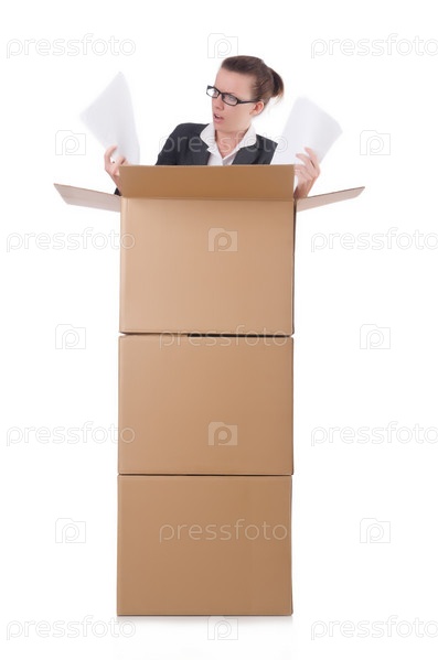 Бизнес-леди с коробками на белом фоне