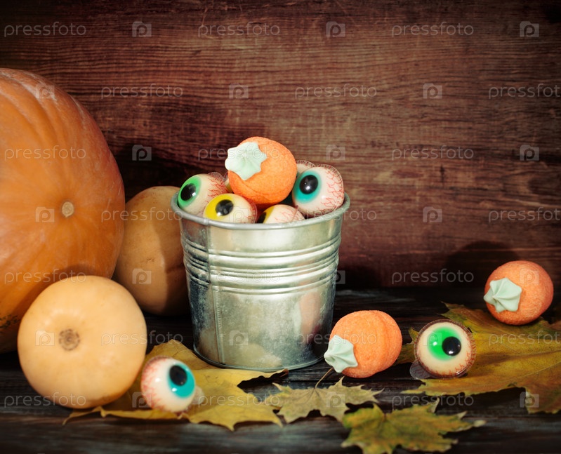 Осенние листья, тыквы и сладости на Хэллоуин