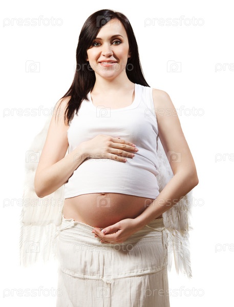 Молодая беременная женщина в белом с крыльями