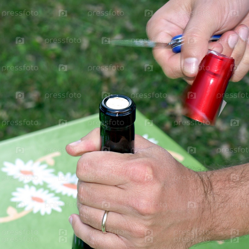 Рука открывает бутылку вина на столе