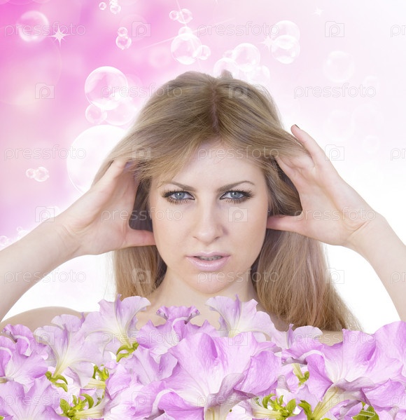 Девушка на абстрактном розовом фоне с цветами. Уход за волосами. Лечебная косметология
