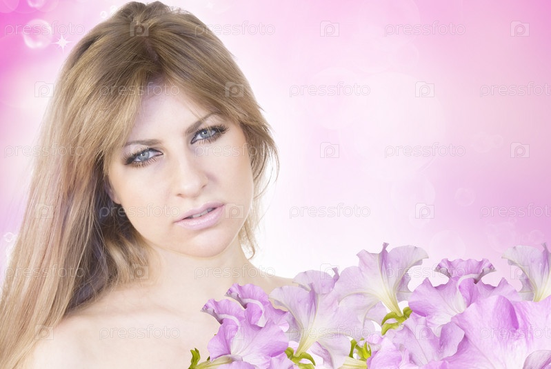 Девушка на абстрактном розовом фоне с цветами. Уход за волосами. Лечебная косметология