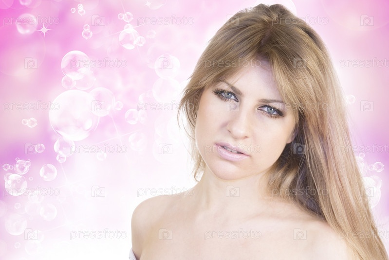 Девушка на абстрактном розовом фоне с мыльными пузырями. Уход за волосами