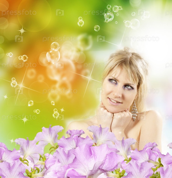 Девушка на абстрактном зеленом фоне с цветами. Уход за кожей тела и лица. Лечебная косметология