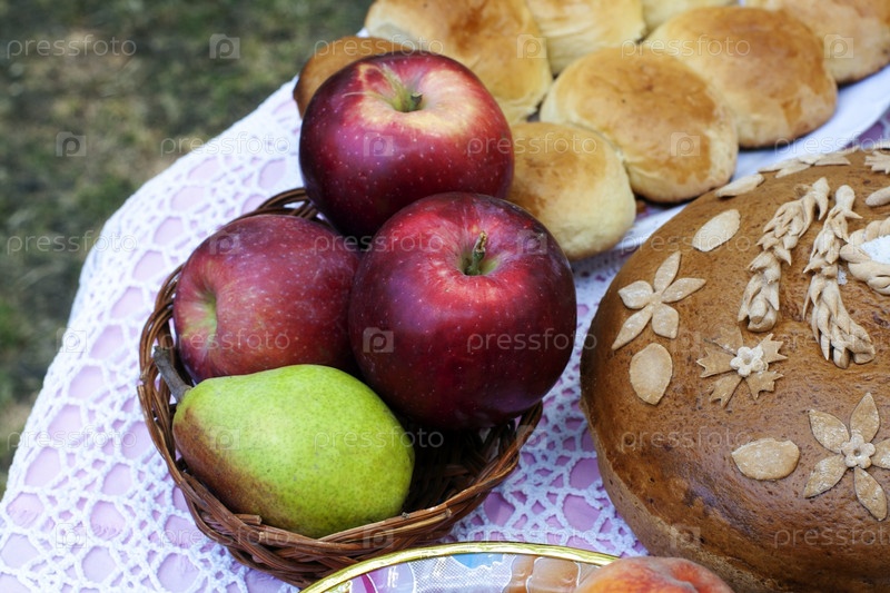 Деревенский домашний натюрморт с яблоками, грушами в корзине и домашним хлебом