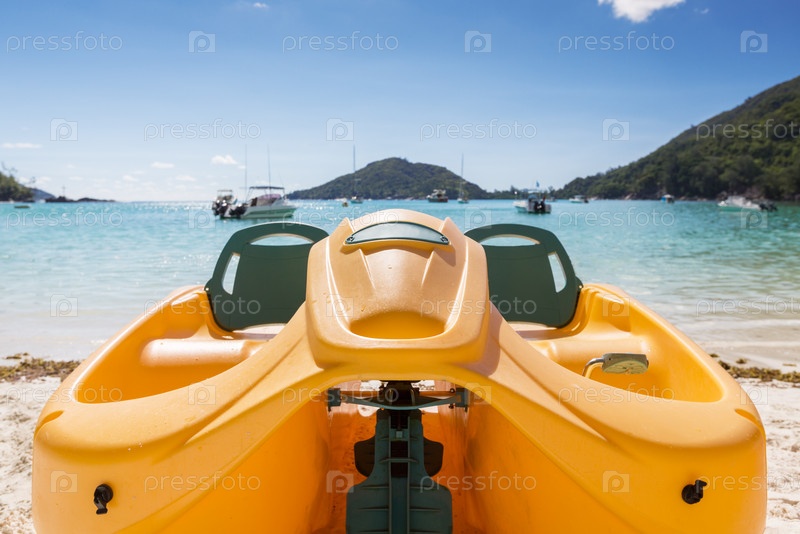 Желтый водный велосипед у причала на пляже с потрясающим видом на океан и холмы