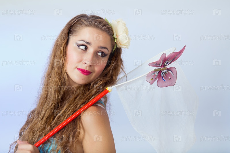 Женщина в стиле пин ап смотрит на бабочку