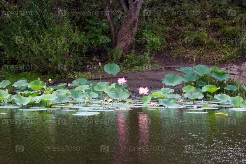 Красивые цветы лотоса орехоносного на поверхности воды