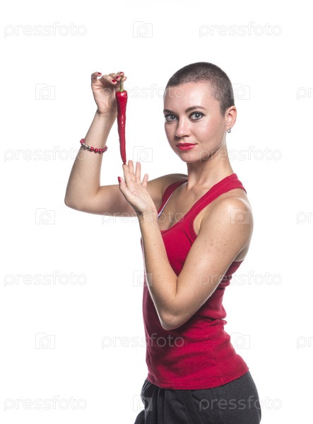Женщина с перцем чили на белом фоне