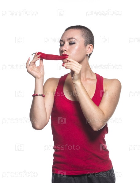 Женщина с перцем чили на белом фоне