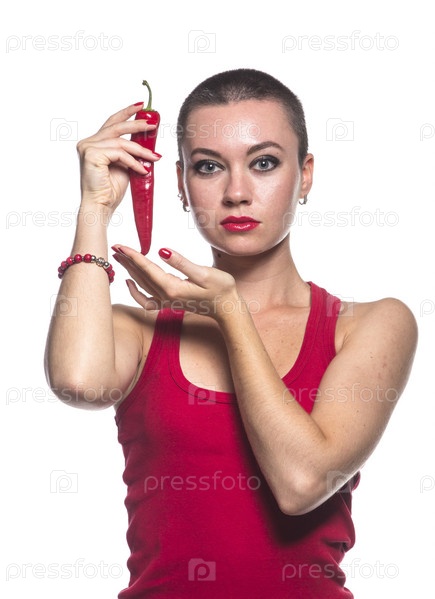 Женщина с перцем чили на белом фоне