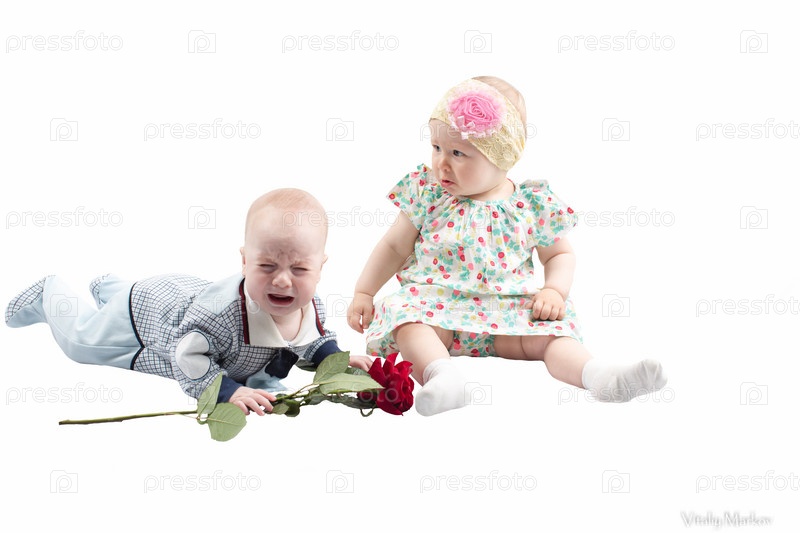 Маленький мальчик и девочка с розой, изолированные на белом фоне. Подарок на праздник