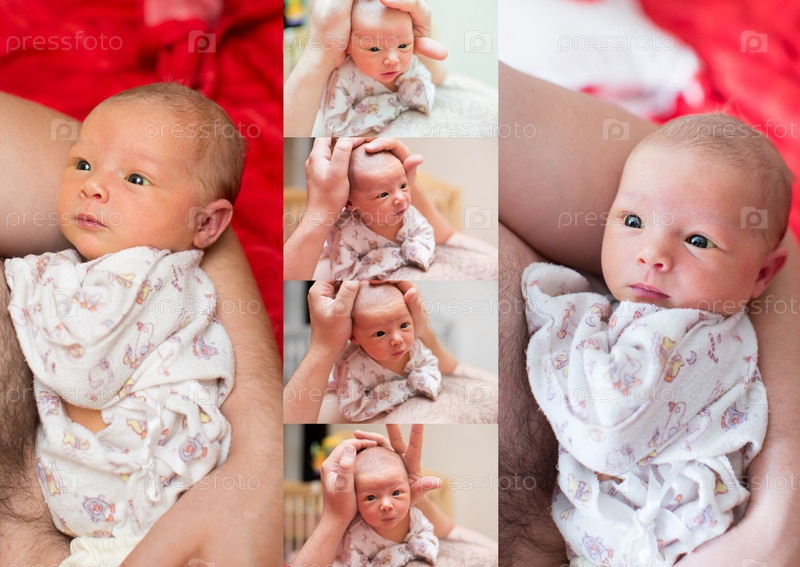 Коллаж, новорожденная девочка на руках отца