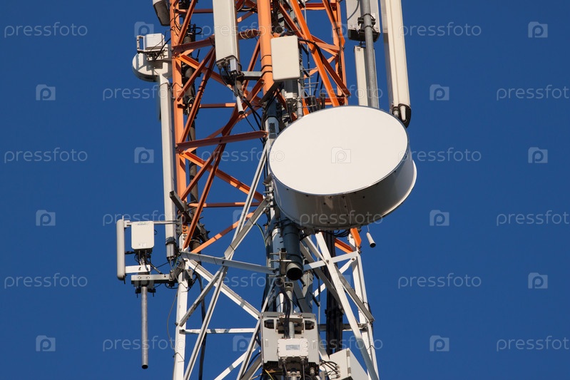 Коммуникационная вышка с антеннами на голубом небе