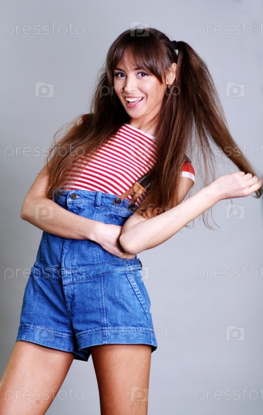 Смеющаяся девушка с длинными волосами на сером фоне