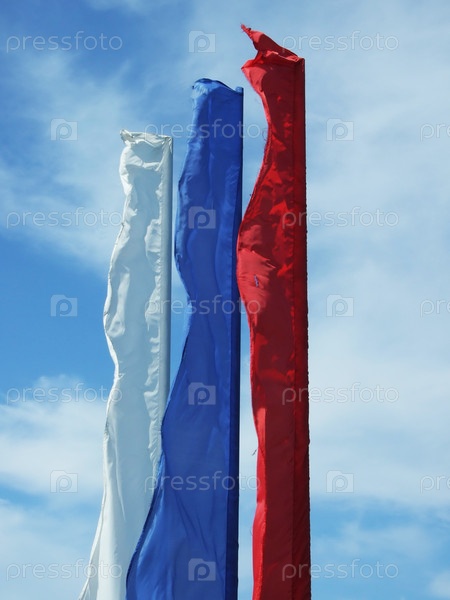 Белый, синий и красный флаги развеваются на фоне облачного неба
