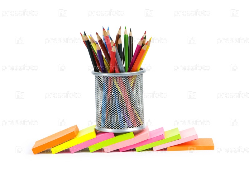 Бумага для напоминаний и цветные карандаши на белом фоне