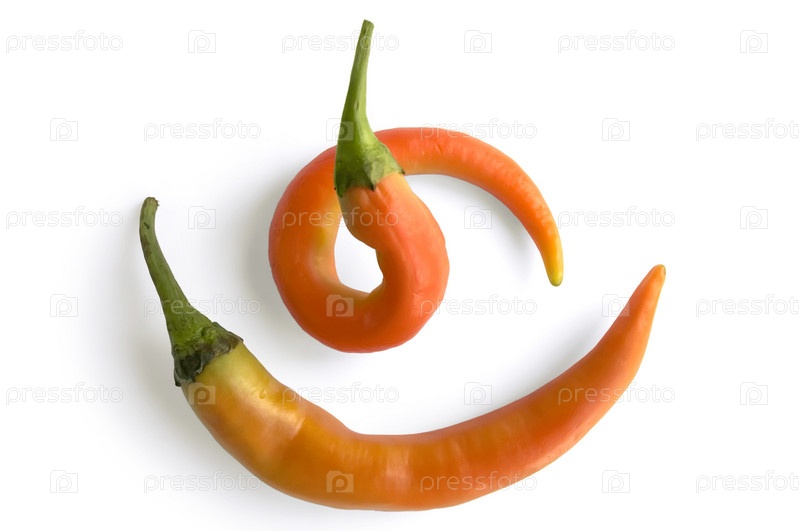 Два стручка острого оранжевого перца, изолированных на белом фоне