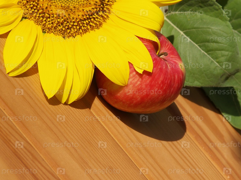 Спелое яблоко и подсолнечник на деревянном столе