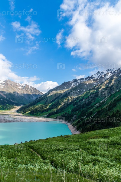 Впечатляющий живописный Большое Алматинское озеро, горы Тянь-Шаня в Алматы, Казахстан, Азии летом