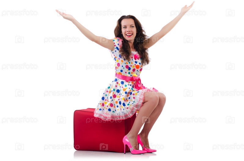 Женщина с красным чемоданом, изолированная на белом