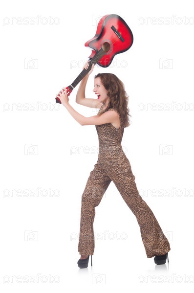 Женщина в леопардовом костюме с гитарой на белом фоне