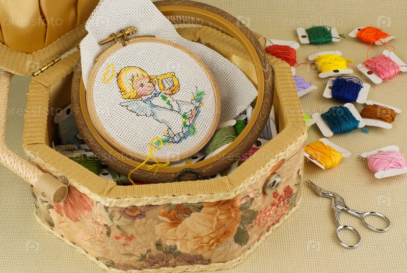Коробка с нитками мулине и ангелочком на пяльцах