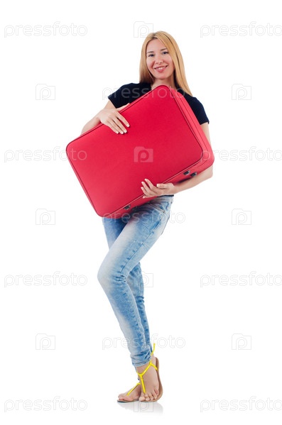 Женщина готовится к поездке в отпуск на белом фоне
