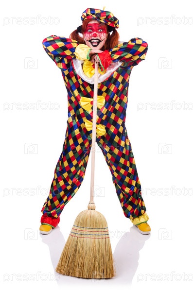 Клоун с метлой, изолированный на белом фоне