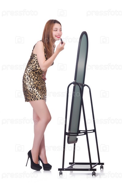 Женщина меряет новую одежду на белом фоне