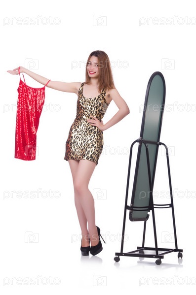 Женщина меряет новую одежду на белом фоне