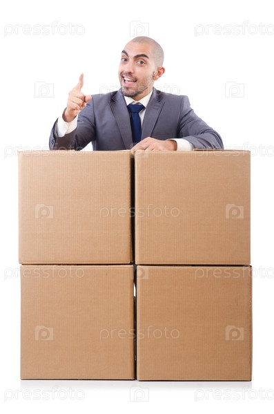 Бизнесмен с коробкой, изолированный на белом
