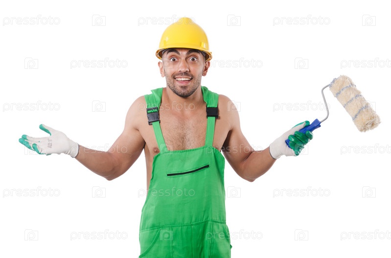 Маляр в зеленом комбинезоне на белом фоне