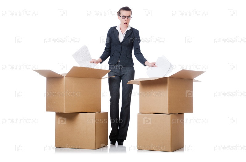 Бизнес-леди с коробками на белом фоне